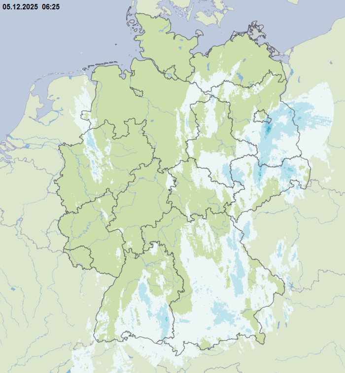 Das Regenradar in einer Auflösung von 1 mal 1 km zeigt Ihnen alle 5 Minuten die aktuelle Verteilung der Niederschlagsfelder über Deutschland. Die verschiedenen Farben kennzeichnen dabei die Intensität des Niederschlags. Die Farbskala reicht von weiß (wenige Tropfen oder Flocken) über blau (starker Regen oder Schnee) bis zu dunkelblau (Hagel). Im Radarbild sind Schnee und Regen allerdings nicht unterscheidbar.